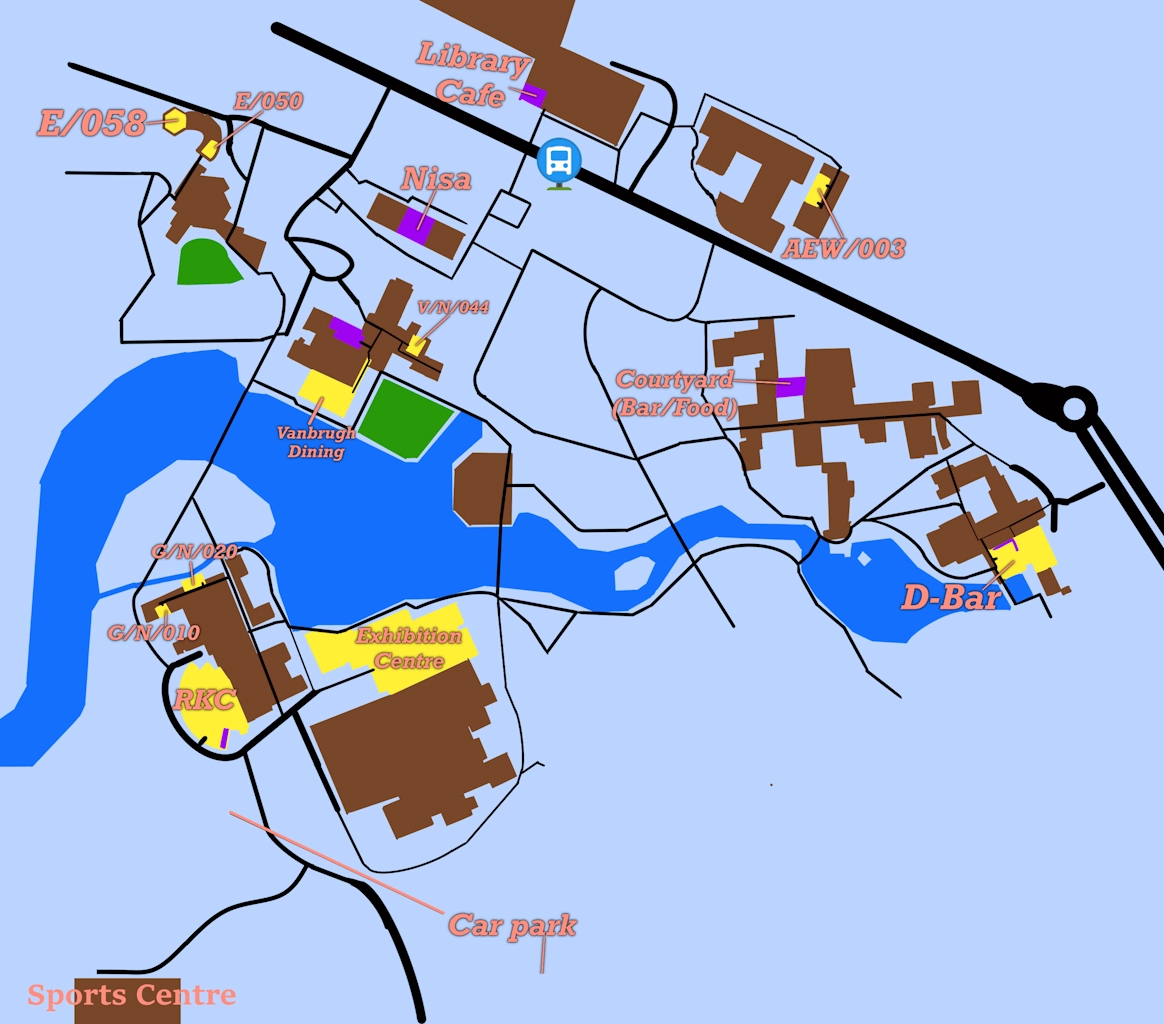 KMZ file of locations.The ticket desk and reception is in Vanbrugh College (room V/N/044) and will be open from 7pm until midnight Friday night, 8:30am until midnight on Saturday and 8:30am until 2:30pm on Sunday. The room is in Vanbrugh College's Nucleus on the Ground Floor. This room is accessed via the foyer area next to the food court and vending machines. through the glass door.